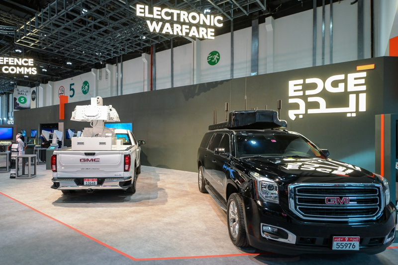The United Arab Emirates-based defense conglomerate EDGE Group unveils its counter-uncrewed aerial system (C-UAS) SkyShield at IDEX 2023.