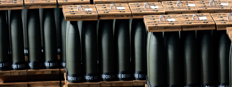 She wears a baggy blue jumpsuit, safety glasses, and a hairnet. Her job is to monitor the viscosity and temperature of the mix—an exacting task. The brown slurry must be just the right thickness before it oozes down metal tubes to the ground floor and into waiting rows of empty 155-millimeter howitzer shells, each fitted at the top with a funnel. The whole production line, of which she is a part, is labor-intensive, messy, and dangerous. At this step of the process, both the steel shells and the TNT must be kept warm. The temperature in the building induces a full-body sweat in a matter of minutes.